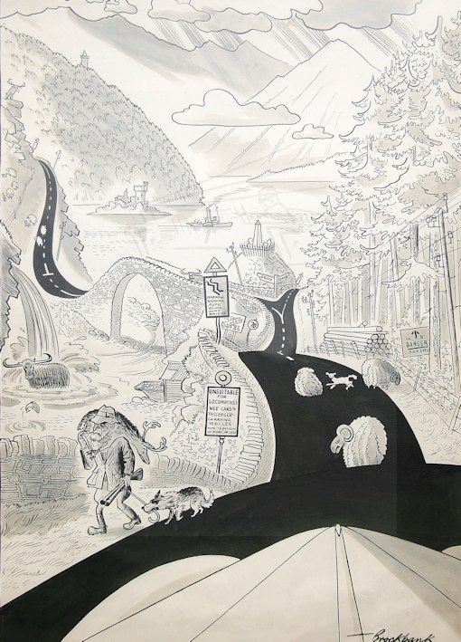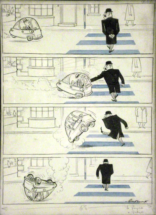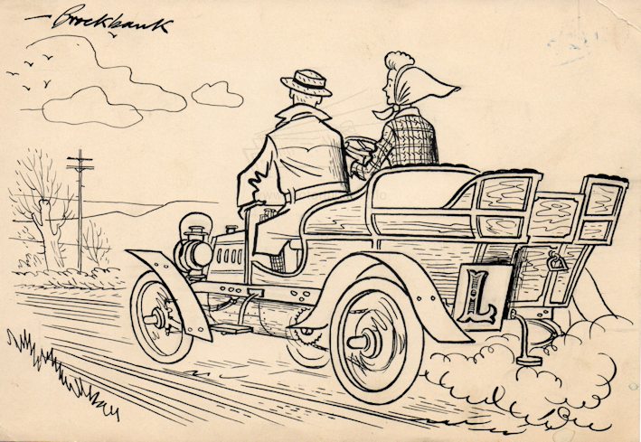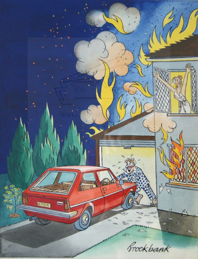 Russell Brockbank is the motoring cartoonist that captured so well the times in which he worked with both general motoring and motor racing. However his skills were far wider than just motoring and from 1949 Russell Brockbank was the Art Editor for Punch magazine producing a wide spectrum of cartoons. Russell Brockbank was born in Canada but his family moved back to the UK in 1929 and he studied Art in London. As a young man he must have been very interested in cars as we start to see drawings from the mid 1930s for magazines such as The Sports Car, Autocar, Speed and later The Motor. He was to have his first drawings accepted by Punch in 1937. The early works are skilful black and white illustrations either with pen and ink or scraperboard, depicting motor racing scenes. Normally his work was signed ‘Brockbank’ occasionally ‘RB’ but some of the early work is just a ‘B’. During the Second World War Russell Brockbank served in the Navy but this did not stop him producing cartoons for various magazines but mainly for The Motor. It was towards the end of the war that he developed his cartoon character Major Upsett, the bowler hated, mustachio, bumbling English gentleman that was to be a permanent part of his Motor cartoons. After the war he was a very popular cartoonist with his work appearing in many publications and also several books of his cartoons were produced. Russell Brockbank rarely used colour to enhance his cartoons, it was the strength of his line work that meant that colour was to some extent superfluous. However it is said that he was not confident using colour but the artwork seen, such as front covers for Punch and calendar artwork, show a very competent use of soft watercolour. We are fortunate that many of the original cartoons have survived from the archives of Punch and The Motor. Also his work was popular at the time so that work colleagues saved any originals that they managed to acquire. This has meant that during the early 2000’s we have seen many cartoons come onto the market where they have been eagerly bought by collectors. The main source of Brockbank cartoons was the sale of The Motor archives in 2001 plus the collection of Geoff Goddard who was a photographer colleague of Brockbank at The Motor. An excellent website about Russell Brockbank and his work has been set up by the family with more details about his life and work plus copies of prints are for sale. The link is given below.