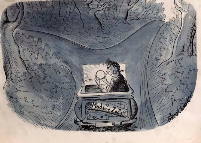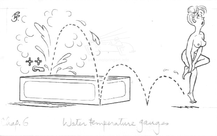 Cartoon for Smiths Industries book DASHBOARD REVOLUTION about the instruments of a car Temperature Gauge