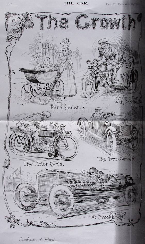 Seems to have been a very busy Artist for The Car – Illustrated with a range of works in the period around 1912. These include paintings, illustrations, cartoons and technical drawings. The ‘ss’ in the signature sometimes have long tails that can look like ‘gg’, as can be seen in the art entitled ‘The Growth’. Besides the script signature there is a uppercase FISSI and the smaller drawings like the technical drawings are just initialled FF. In 1909 he produced 20 illustrations for a book about Beaulieu Abbey. Whether this resulted from a motoring connection with second Baron Montagu of Beaulieu is not known/ Fissi emigrated to the USA in 1924 and would have seemed to have moved into the cartoon/movie picture industry. For fuller details see below.