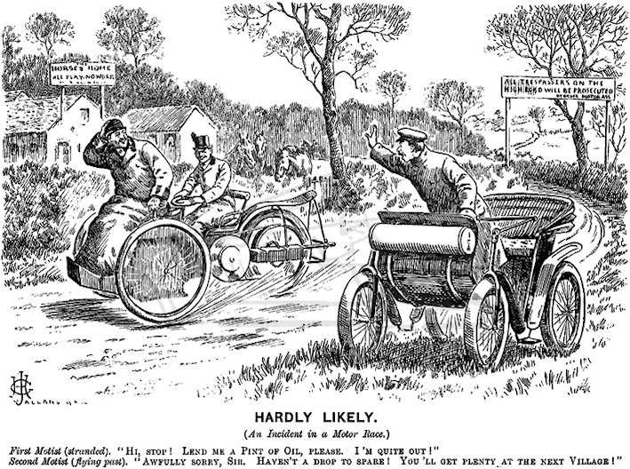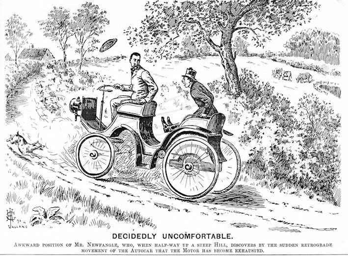 Jalland was an author, artist and illustrator that drew a whole range of sporting subjects. Probably best known for his equestrian work and was similar to Leech, depicting the humours of the sport. It is not surprising that his humour include the early motor cars and he was a regular contributor to Punch, The Sporting Magazine, The Graphic, Pall Mall Magazine and Fores Sporting Notes and Sketches. He signed his work with a monogram of his initials followed by his surname and often the date. The image illustrated alongside is dated 1901.
