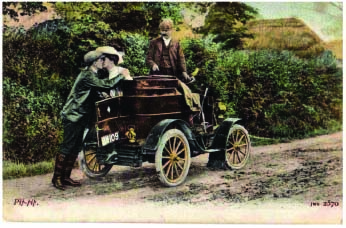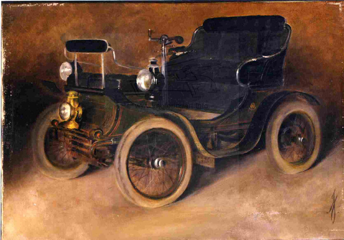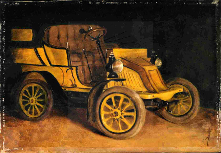 I have two photographs of oil paintings on canvas (size 13 x 9 inches) of veteran cars, these are reproduced herewith. At first glance there is nothing too remarkable about them, until one realises that they were contemporary and were painted by an artist A. Johnson in 1903. (Any UK original motoring art of this date is extremely scarce). There are limited clues about the history of the pictures other than the artist’s name and date on the painting’s stretcher and they have the artist’s monogram AJ at the low right. The paintings are on Rowney canvas and the framer was Tibbenham. It is known that at the turn of the century Tibbenham had a business in Ipswich as framers and fine art dealers. Another factor pointing towards an East of England origin was that they were acquired several years ago by the present owner from a paintings auction in Norfolk. The cars themselves provide no definite clues about the owner. The first is a 1900 De Dion Bouton Model E with 3½hp or Model G 4½hp engine (probably the Model E) with a standard ‘vis-à-vis’ body in black (or very dark green) with red coach-lining. The small red circular sign on the side panel of the car is the De Dion Bouton factory transfer mark and not an owner’s heraldic shield. Malcolm Jeal advises that Mulliner of London were one of the agents for De Dion Bouton and some of their contemporary sales records still survive in the care of the Veteran Car Club. The only car listed with black bodywork and red coachlines was supplied on the 18th April 1901 to J N Hayball Esq. No address is given. There are no records of deep green cars but it is emphasised that the sales details are incomplete. So it is highly likely there were other black or green cars sold of what was a popular car at the time. The second car is more unusual. It is a Decauville 8½hp twin cylinder car with standard rear-entry tonneau factory bodywork in yellow with brown and black detail. This was a model introduced in about March 1901 by the UK agents – Motor Car Company Ltd of Shaftsbury Avenue, London. A distinguishing feature of the Decauville was that the radiator was at the rear of the car. Unfortunately this cannot be seen from the front view depicted by the artist. Malcolm Jeal was able to supply a photographic humorous post card entitled ‘Pip-Pip’ of a similar car which clearly shows the radiator and rear entry bodywork. The car carries a Portsmouth registration and the picture was taken in 1904 (after 1st January 1904 when registrations became mandatory and it was postally used in November of that year). The other features that point to a Decauville are: the black boss, below the distinctively shaped front splash board, through which the starting handle passes; the separate brake and gear levers and their respective positions; the dished steering wheel; the minor controls on the column; the dashboard shape with its square corner cut-outs and iron grab handles; and the very thick seat back. The only non-standard feature of the yellow car is that the front face of the coal-scuttle bonnet is slightly concave whereas it was straight on a factory model. Whether this was true or ‘artistic licence’ is not known. It is interesting that one of the few known Decauville cars was in fact owned by Reginald Egerton of Botwood and Egerton, Ipswich garage and motor car dealers. (Incidentally Reginald was the brother of Hubert, who was one of the principals of Mann, Egerton & Co of Norwich). Reginald’s car could be the same but it is believed that the Egerton car was a dark colour not the yellow car of this example. If it is not the same car, there is evidence of a local East of England interest in the marque. At first appearance the paintings with their plain backgrounds seem to be the type of art a manufacturer may have produced for early sales literature. But looking in detail one can see that the artist had some problems getting the correct ellipse shape of the wheels and other features, suggesting the works are by a good amateur or minor artist not by the professional artist that a manufacturer would use. This is confirmed by A Johnson not being listed in major artists’ directories. The conclusion is that the owner of these cars commissioned these works from a local artist, just as owners of horses for many years had paintings of their favourite mounts on the wall. In that case the person was without doubt one of the first, if not the first, automobile art collector. Can any reader advise from their knowledge of veteran cars who owned an early De Dion and Decauville prior to 1903, probably living in Norfolk/Suffolk? {Many thanks to Malcolm Jeal for considerable assistance with identifying/supplying information about the cars and the loan of the postcard. The photographs of the paintings are reproduced by kind permission of CURTIS LANE & Co photographers of Sudbury}