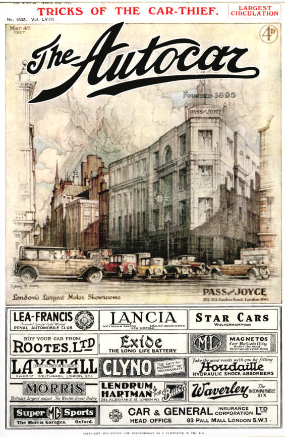 Pass & Joyce showroom, Autocar front cover 4 March 1927.