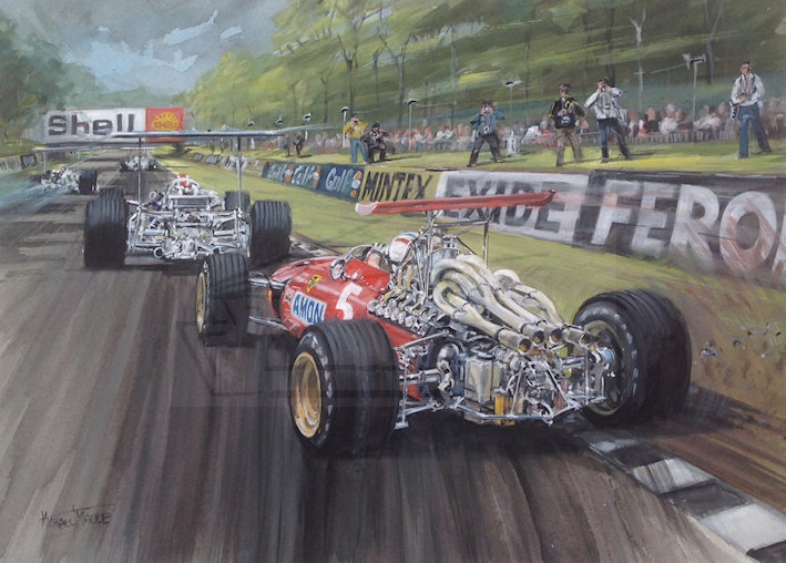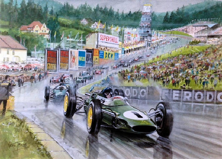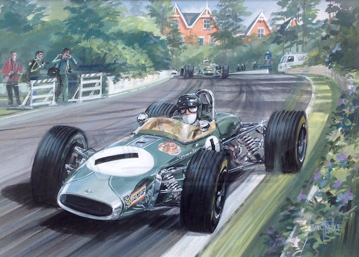 Artist, Illustrator and professional architectural photographer. Herewith in his own words is his biography. "I was Born in Balham, London a long time ago. Left school at 15 and started work at Harrods in the display department in 1958, 2 years here. As well as going to Putney school of art, and St. Martins in the evenings. Then onto City Display Organisation, travelling around the south of England doing window displays for about 3 years. Another 2/3 years at cosmetics companies, again design and window displays. But all the spare time painting motor racing scenes, all on commission. Sold my first to Don Parker who was 500cc national champ at the time, I think I was about 12 then and still at school. Don used to take me to all the races around England. And introduced me to the then, current racing stars. E.g. Graham Hill, Stewart Lewis Evans, Archie Scott Brown, Jack Brabham. To name but a few. My father having introduced me to motor racing when I was about 8. I think he was quite glad that he didn't have to take me, as we didn't have a car at this time. I Was then offered a assistant display manager at the department store, Derry and Toms in Kensington, which was great and lasted another 2 years. Then late 1960s a job for Les Leston Motor accessories, designing window displays and exhibitions. Also working with the designer Derek Newton, who did Most of the shell schemes at Earls Court, Olympia, and various other exhibitions around the country. I remember diving up the M 1 to Harrogate with a 8 ft crocodile sticking out of the sunroof. This was for a Michelin stand. At one Motor racing show at Olympia, I presented a painting to the winners of the London to Sydney marathon, via BRSCC. At the same exhibition, I designed and built a stand for a competitor of Les Leston, (not too sure if he knew) also the centre display of that years f1 cars, which was supposed to be static. I happened to suggest to Derek Newton , why not have a driver in "action", behind the wheel.!! I ended up making a chicken wire torso of Graham Hill which I dressed in his overalls and helmet, the only bit was a have to sculpt a head, showing the eyes. As everyone wore face masks then, which was handy. Anyway it turned out ok, and even got a mention in "Autosport"that week. "Saying Graham opposite locking the Gold Leaf Team Lotus, on the banking!?" On the centre attraction. Started racing in the late 60s.( again I was really busy then) with part sponsorship from a clothing company in Kensington Market, called "mother wouldn't like it" I shared with my good friend Terry Nalden in a mk1 Sprite, the other car was a mk2 with a 1200 engine, and driven by Bob Evans. Both were painted in Purple. Ours was not that successful but we did that for a few seasons. And was great fun. During this time I got to know Alan Baillie who was racing a Lotus Elan, in sports cars. He had a Dulon FFord which was converted to a monoposto format. I mechaniced for him the following year in the monoposto championship, which he won for 3 years running. Later I Helped a bit on a clubmans car, the"Hustler"built by Richard Groombridge. Who also did well. The commissions were coming thick and fast, with the club scene, selling at least 2. a week. Also photography. Which I was using as a reference for the paintings, and selling them as well. A commission from Ronnie Peterson in the Vicks f2 march. I think this was for his manager. James Hunt took me to lunch to try a persuade me to do a painting for him, at a greatly reduced rate, he did buy lunch.i completed it anyway. Denny Hulme commission of Range Rover and boat.! The photography took another turn, as I had got to know an estate agent in Wimbledon, who asked me to do some black and white photographs for his window, which I did. Then it it seem to snowball, as the agents had a branch in the Kings Road Chelsea, before long I was photographing for the majority of estate agents in London. Also doing Artist impressions of the outside, and sometimes interiors of buildings. As the majority were covered in scaffolding. So not possible to photograph. This progressed to Southern Ireland, which literally exploded with commissions, as I seem to be the only person doing this, in think one client said, "there is only ..one other, and he's in pub. " I would get a pile of plans and elevations, of mainly shopping centres, in the morning post, I always insisted on hard copy, unfortunately they were usually ,A1 size, so it would take me a day in interprete them, and of course they were needed the following day!!!!...... so I would be working 24 hrs a day 7 days a week, or it seemed like that.. I decided to slow down the photography about this time as it was getting too difficult getting around London. I still get clients phoning to ask if I still photograph. But I much rather stick to painting, cars, houses, planes, horses, and anything else that takes my fancy. I am now semi retired, but still have a large client list, although CGI has helped me with the workload. As I don't get involved with that. I spend my time travelling to Kenya, 2/3 times a year with my wife, where we do a lot of work with the people, and schools in a small village. I also scubadive there as well, which I have done for 30 years now, also mountain biking when I get the chance. I have a couple of old cars, one a real classic, which I work on frequently."