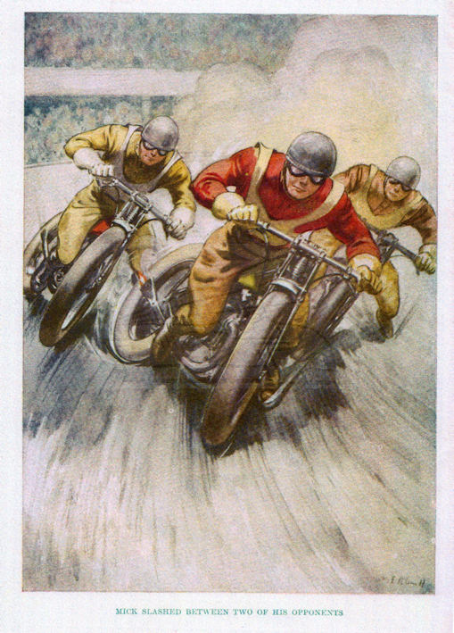 Illustrationfrom 'Triumphs of Sport and Speed' titled 'Mick Slashed Between Two of His Opponents'. Image courtesy of Michael Worthington -Williams.