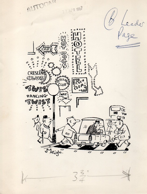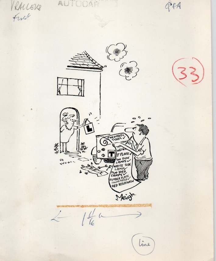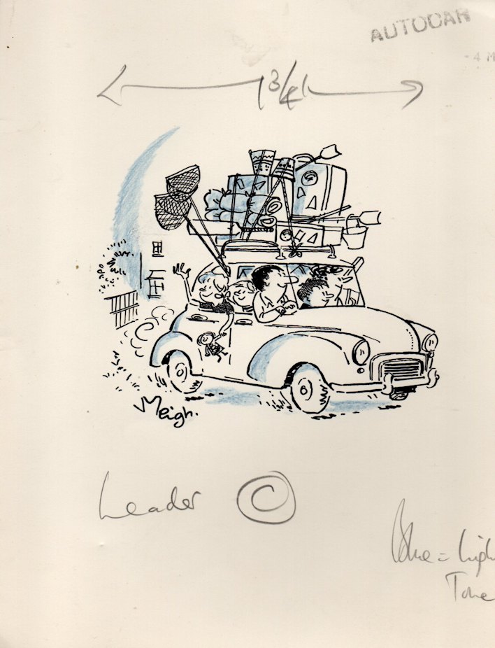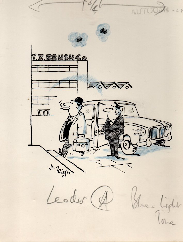 Phil Meigh became a cartoonist after war service. He started selling cartoons to popular publications of the time. He developed two cartoon strips for Swift 'Hopeful Harry' and 'Fanciful Freddie'. He worked for Punch over a 25 year period and newspapers such as The Times, Daily Sketch and Daily Mirror. He obviously worked for The Autocar evidenced by these five humorous drawings from 1967, these were used as 'Leader Headings'.