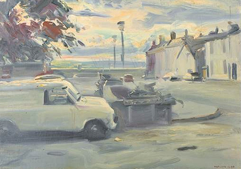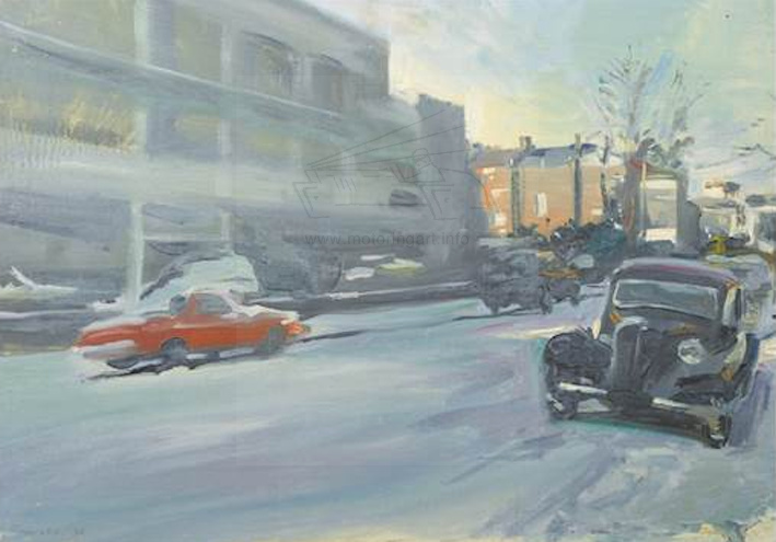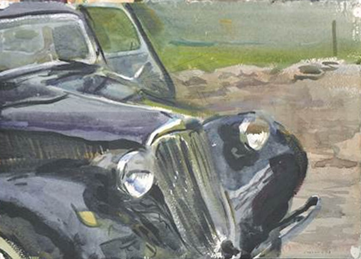 Famous current artist with many important works and exhibitions to his name. Member of the Royal Society of Portrait Painters and sitters have included the Queen, Queen Mother and other members of The Royal Family. He is nearly equally famed for his landscapes. Some of which have vehicles in them and in fact on his website has a section on Cars. In 2016 John Nicholson auctions sold a large collection of the artist's work which included many views with vehicles