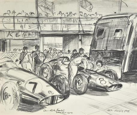 Pencil sketch of BRMs at Silverstone