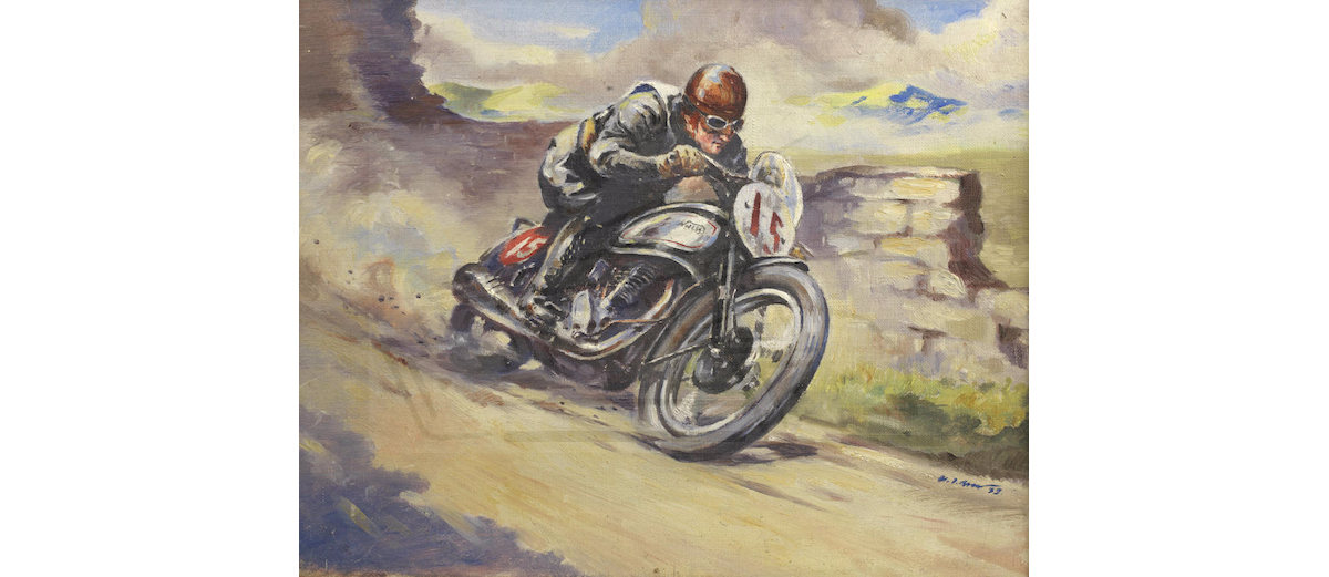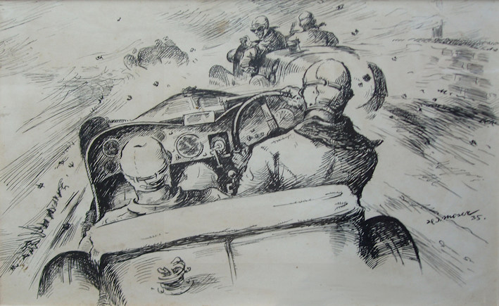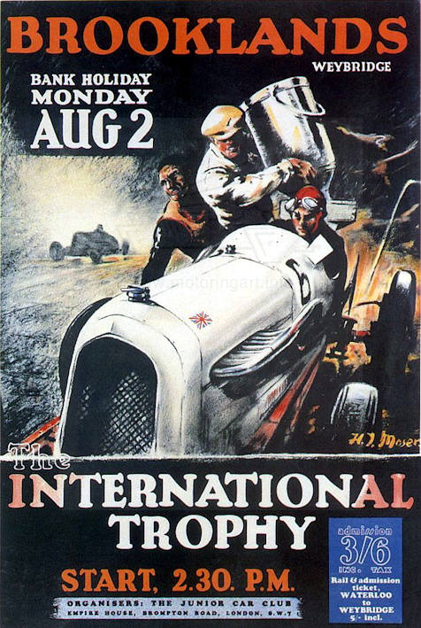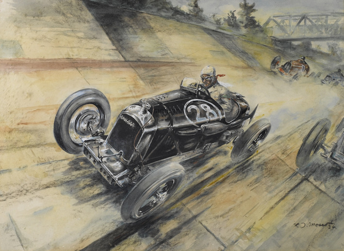 Up to 2016 nothing was known about H J Moser except his initials and surving artwork. Following research by Stuart Middlemiss it was realised that Moser had survived the War in the UK. At the same time I was contacted by a niece of Moser which led to meeting his son John Gretton, hence we have been able to build up a good biography of this important artist. -----------------------------------------------------------------------------------------------------------------------------------------------------------------------------------------------------------------------------------------------------------------------------------Hans Moser was born in Germany on 23rd October 1904, probably in Lankwitz a southern suburb of Berlin. His father Alexander was from a Jewish ancestry, the forebears having been expelled from Spain in the late 15th century. Alexander had converted to Christianity before his marriage and was an affluent stockbroker. However, like many people he lost most of his wealth in the 1930 stock market crash and the family had to move out of their luxury villa. Hans was the eldest son and one of four children, one daughter and three sons (Kate, Hans, Fritz and Rudolph). The children were brought up as Christians. Hans was a bright pupil at school but rebelled against the pedantry of his schoolmasters. On leaving school he was found a job by his father in a bank where he was equally bored. He filled his time by using the bank stationery for sketches and caricatures. After leaving the bank it is understood that he enrolled in art classes but it is believed he was equally rebellious. The studies only lasted a short time. The art classes however, resulted in Hans becoming a freelance artist. He provided illustrations for German publications ‘Motor und Sport’, ‘Kolnische Illustrated Zeitung’ and publications for the German Automobile Club (ADAC). Also by 1931 we start to see his work being used by the UK ‘Illustrated London News’. Whether he had visited the UK and made the acquaintance of staff at the magazine or his work was forwarded by an agent is not known. It is more likely to have been via his art agents who he complained always took a large part of his fees. He must have had sufficient means from his art or the family, to go racing (probably motorcycles). By 1932 his art was being used for car race programmes - International car races at the Avus track and later that year at the German Grand Prix at the Nurburgring. When exactly Moser came to the UK is not known but probably 1933/34. Although only half-Jewish and technically a Christian the Nazis were coming to power in 1933 and the anti-Jewish laws meant that Hans could not work as an artist. Also his father Alexander had died that year. By this time his sister Kate was living in London and her husband was working at the German Consulate as a Commercial Attaché. It could be assumed that she assisted him when he arrived in the UK. This is possibly not the case as he was very poor and times were hard. It is believed he had some commissions from ‘Illustrated London News’. He had brought from Germany a grisaille painting of the battle of Trafalgar which he showed prospective clients. This drawing is still retained by the family. It is interesting that he soon became accepted as he produced the artwork for the 1935 British Racing Drivers Club (BRDC) Christmas card. Also he sold motor art on commissions such as the view of an Amilcar on the Brooklands banking dated 1935. This is possibly one of his best examples of larger artwork is compared to the size of his normal output. Probably one of the connections that allowed him to become rapidly established was John H Gretton, a very prosperous corporate lawyer and father of his future wife. John H Gretton was a pioneer motorist and was Chairman of the MMC (Motor Manufacturing Company). He had taken part in the 1900 1000 Miles Trial. Albeit John H Gretton was probably more interested in yachting by the 1930’s but he would have still had friends in the BRDC and Brooklands. (Gretton owned a large America’s Cup type yacht). The connection with J H Gretton had probably been established via the German Consulate as Gretton was very much involved with overseas commerce. In thanks Moser had presented Gretton with the painting of Trafalgar. Hans and Joan were married in Kensington during the second half of 1936 The advent of Speed magazine (Official publication of the BRDC) in June 1935 must have been the perfect vehicle for Hans to show his talents. Besides his wonderful artwork for the covers, plus drawings, sketches and cartoons, there were also supplements in the early magazines of Moser art. These supplements were a loose slip-in, so often have been lost or removed. They allowed the readers to frame the art without removing pages from the magazine. The first supplement titled ‘Dawn’ shows an early morning view of a garage with the mechanics resting after working all night on a racing car. There is an introduction to say “These plates are the work of H J Moser a brilliant young artist, who himself has raced on the Continent, and whose drawings are only to be found in the pages of ‘SPEED’.” It is assumed that Moser was probably a salaried staff artist for Speed magazine, however something went wrong in 1937 as the supply of new artwork ceased, albeit a few cover designs were repeated. No doubt he had to fall back on working freelance. It is not known where he worked other than producing some Brooklands posters and programme covers in 1937/38 for the BRDC and the Junior Car Club. Also the cover artwork for the 1938 Castrol Achievements booklet. The artwork for the 1938 South African Grand Prix featured a Moser painting of a speeding red car on a banking. This had previously been used as a cover design for Speed magazine so it is assumed that Moser did not have a RSA connection but the image had been ‘lifted’ from the magazine. It is believed by the famil