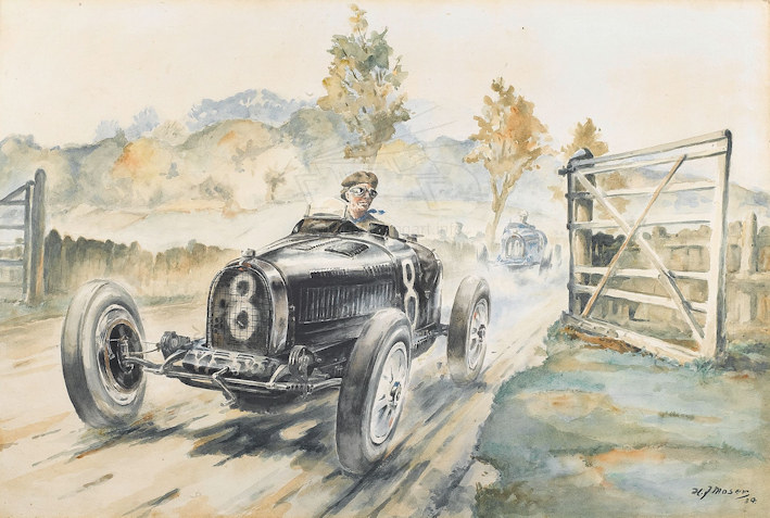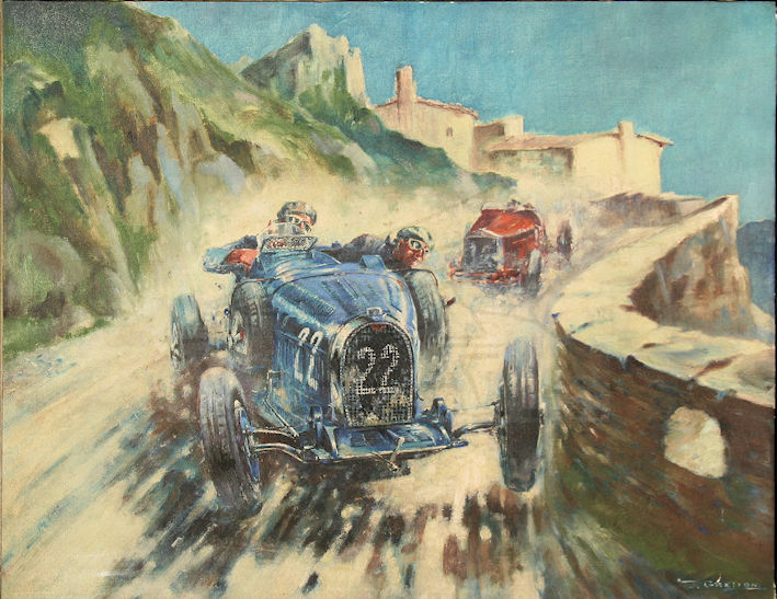 Targa Florio painting of Bugatti leading an Alfa Romeo signed J Gretton.