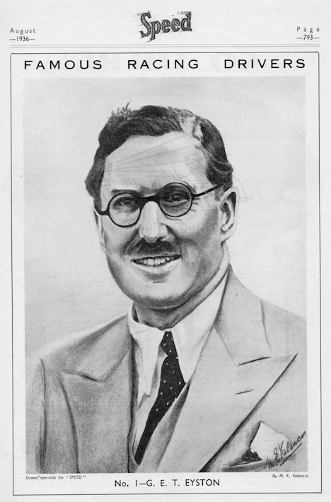 Portrait of George Eyston in Speed magazine August 1936 and subsequent series of similar portraits each month.